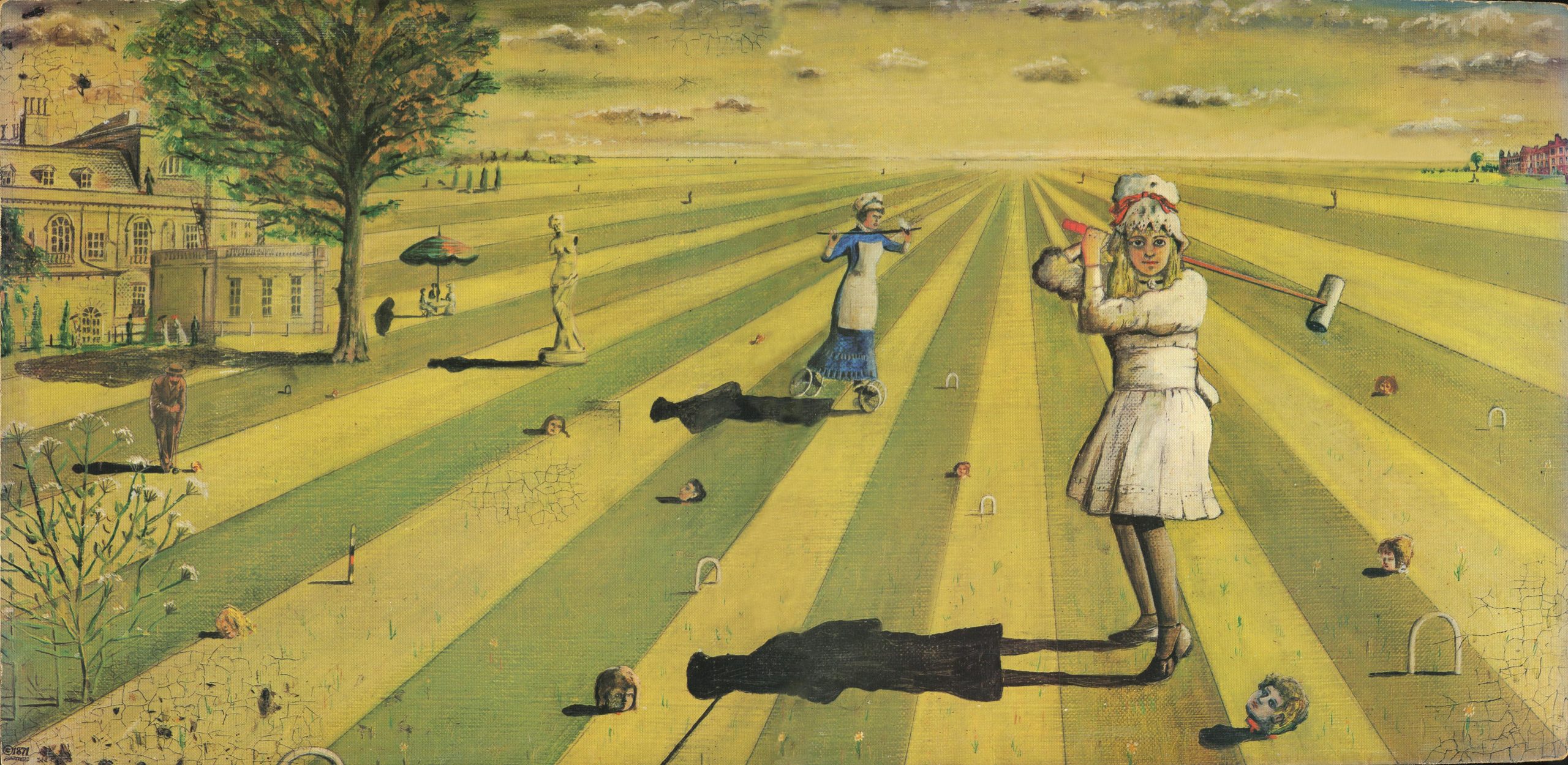 1imagen…juego de croquet surrealista(sustituye la pelota por cabezas cortadas)….primera horizontal (niña asesina)….(te mira satisfecha)…..(el proximo seras tu)…..