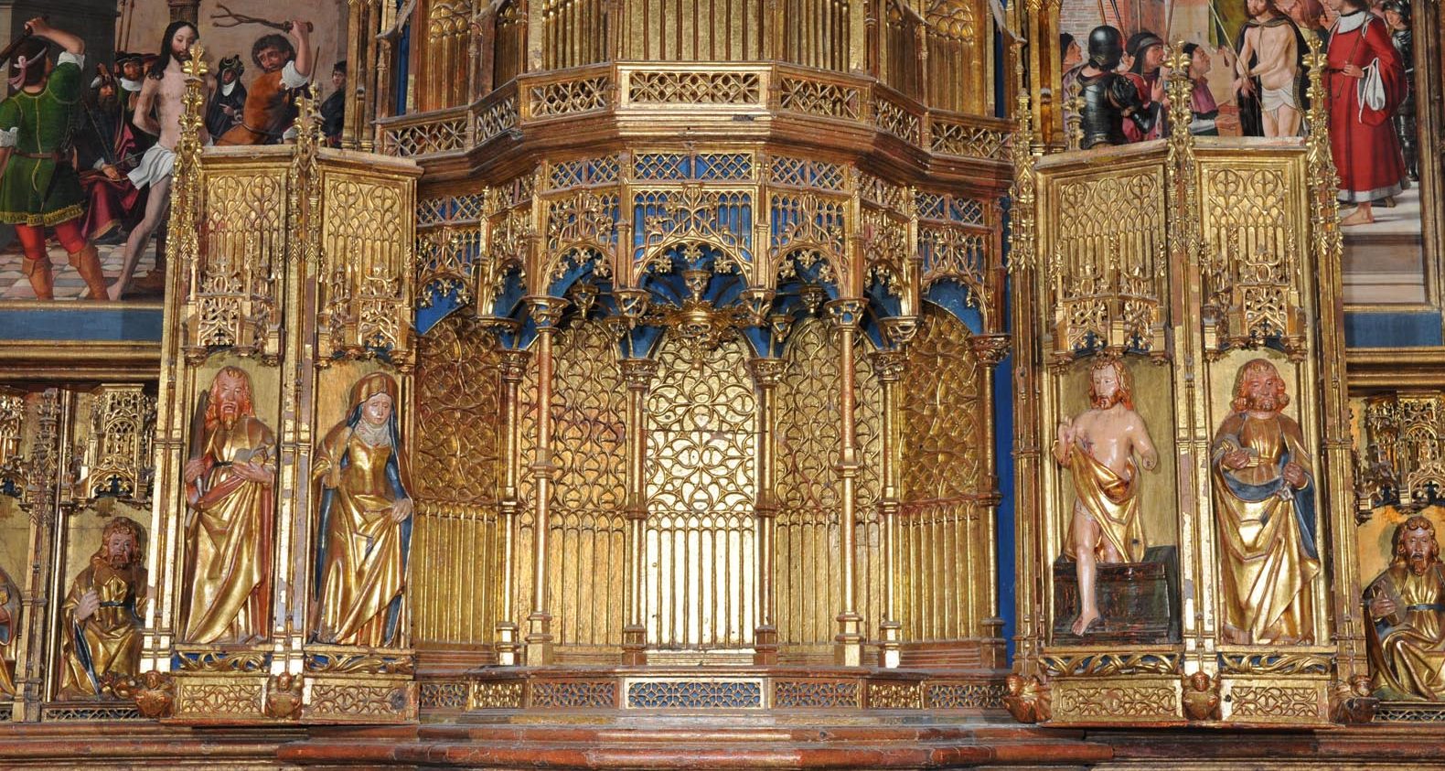 He contemplado tantas iglesias y ermitas durante estos días que La Colegiata no me impresiona desde el exterior. Pero es inevitable no sobrecogerse, una vez ya dentro, al contemplar el retablo del altar mayor. Una obra gótica en la que confluyen de manera casi sobrenatural esculturas y pinturas. Tablas pintadas «al temple» y tallas de madera policromada dedicadas a la anunciación de María y la pasión de Cristo.